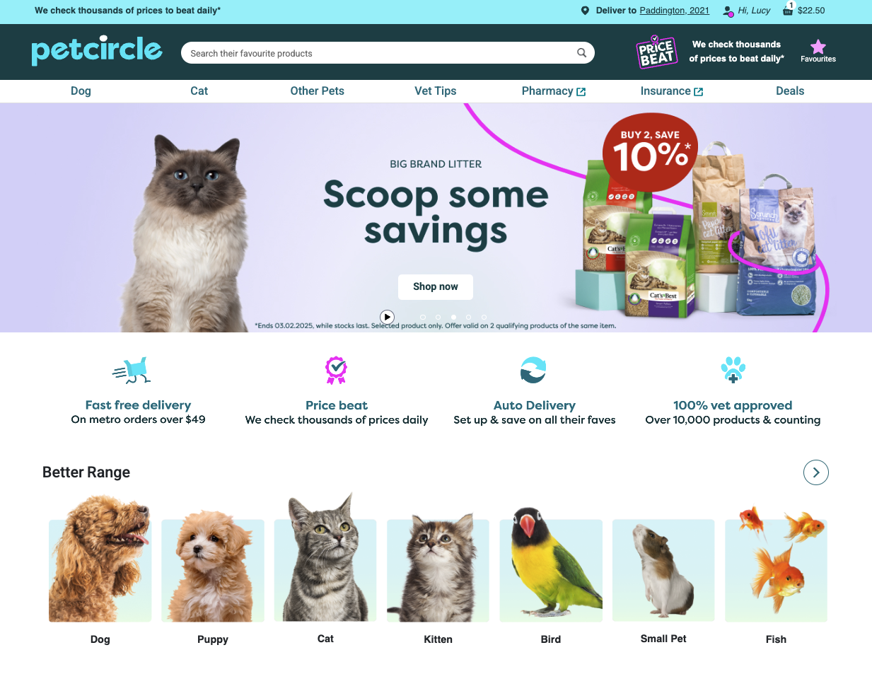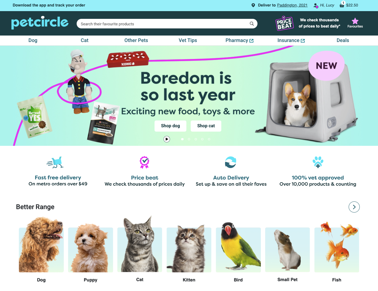 As copy lead at Pet Circle, my always on tasks involved writing performance driven, data-led copy for homepages, product description pages, app copy, UX copy & more.